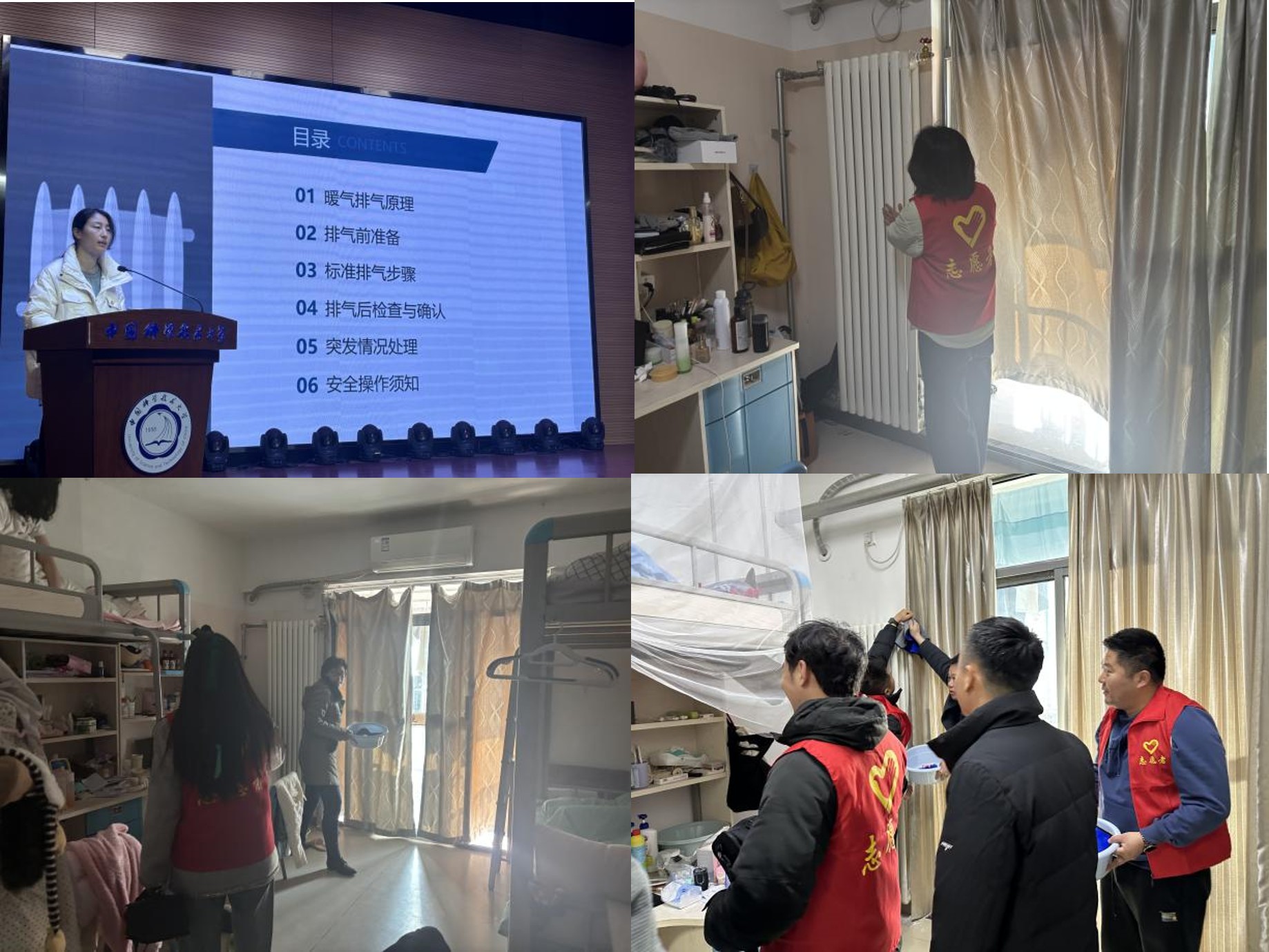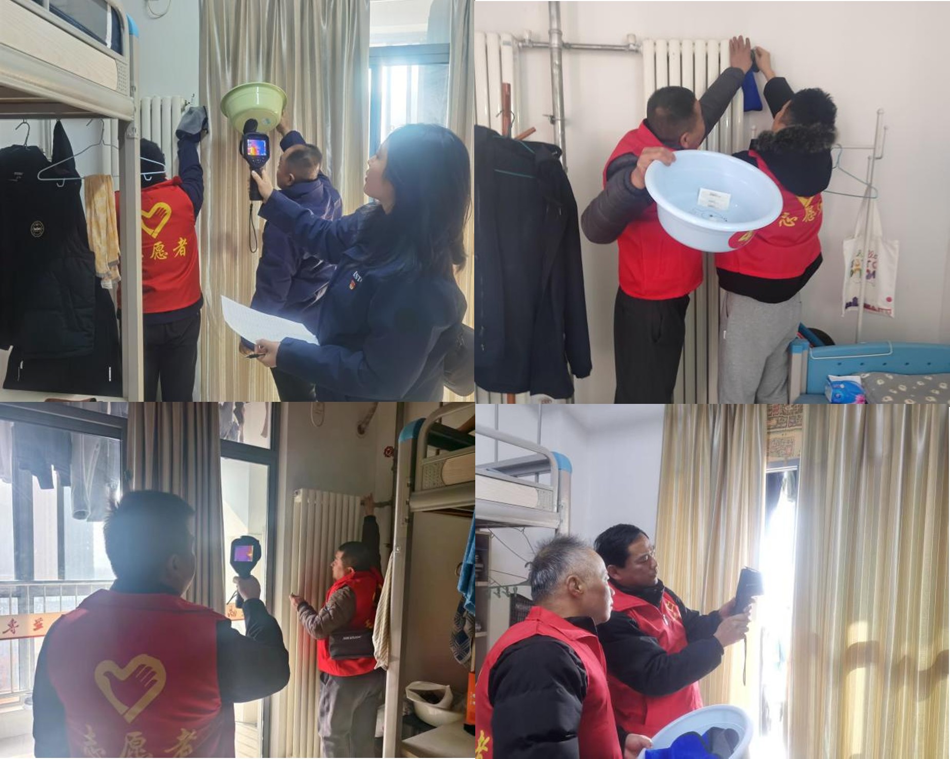 会后,各志愿小组前往中区学生宿舍,逐户排查暖气故障,按照规范流程为宿舍进行排气操作。对个别暖气效果不佳的宿舍,志愿者进行深入检查并记录在案,安排后续专业维修。