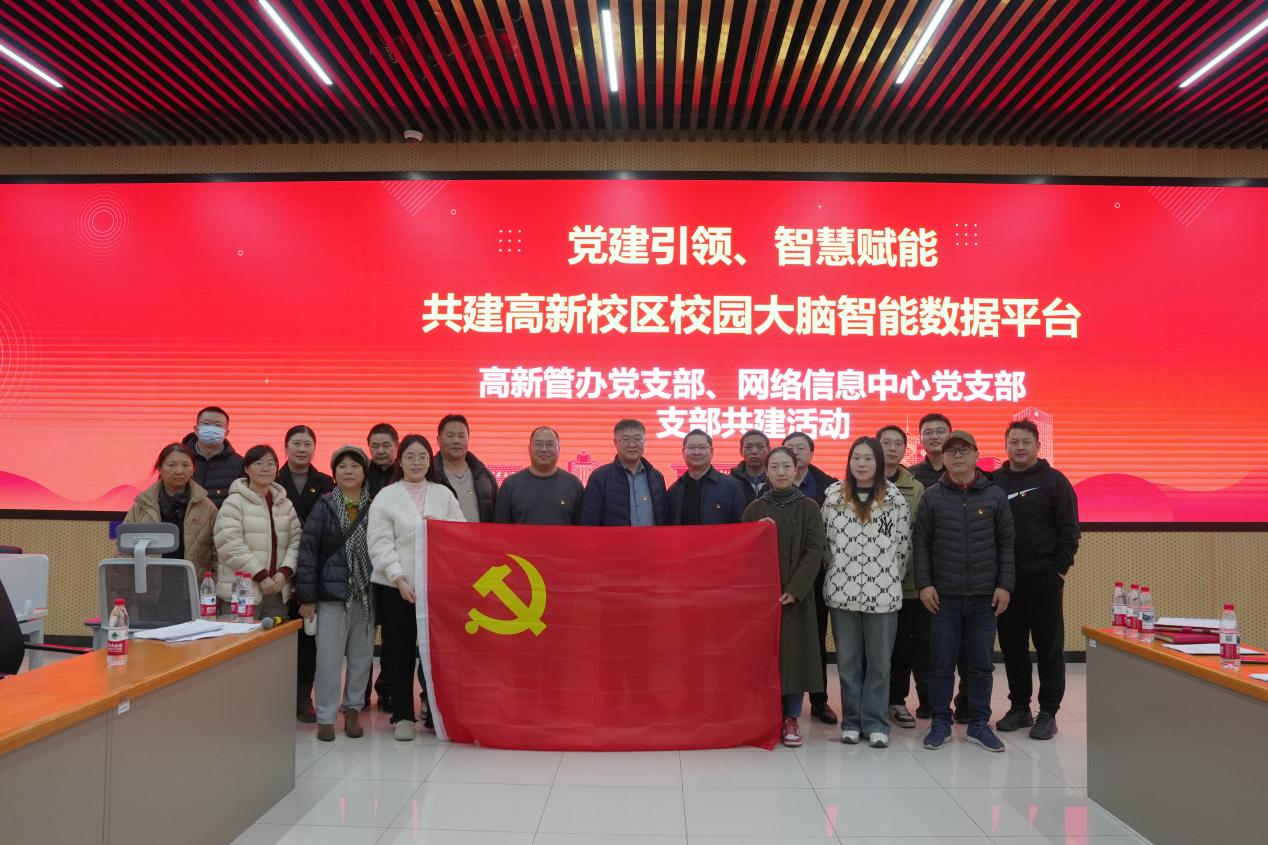 为深化党建引领,推动党建与业务工作深度融合,以智慧化建设赋能高新校区高质量发展,12月30日下午,高新园区建设与管理委员会办公室党支部与网络信息中心党支部在高新校区一号学科楼联创中心,联合开展了以“党建引领,智慧赋能——共建高新校区‘校园大脑’智能数据平台”为主题的党日活动。活动由高新园区建设与管理委员会办公室党支部书记朱洪超主持,两共建单位支部的全体党员参加。